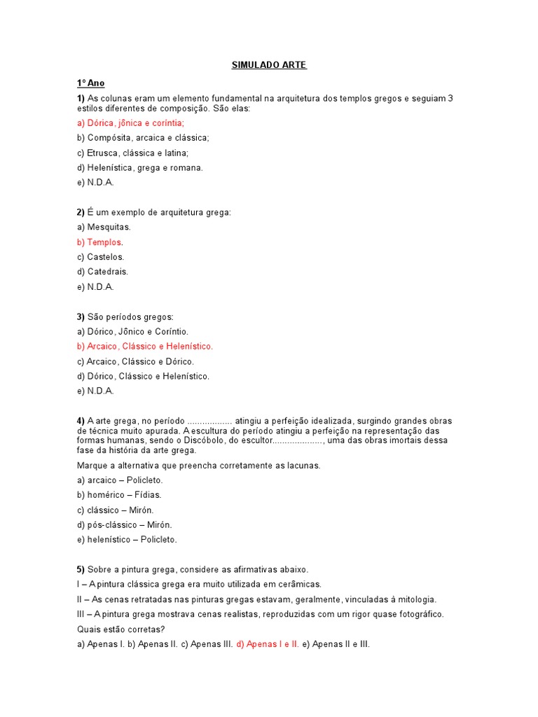 Nome: nº. Data: / / Trabalho de recuperação 1º EM Arte Prof. Denise ARTE GREGA. QUESTÃO 01 Sobre a arte feita na Grécia antiga marque a alternativa - PDF Free Download